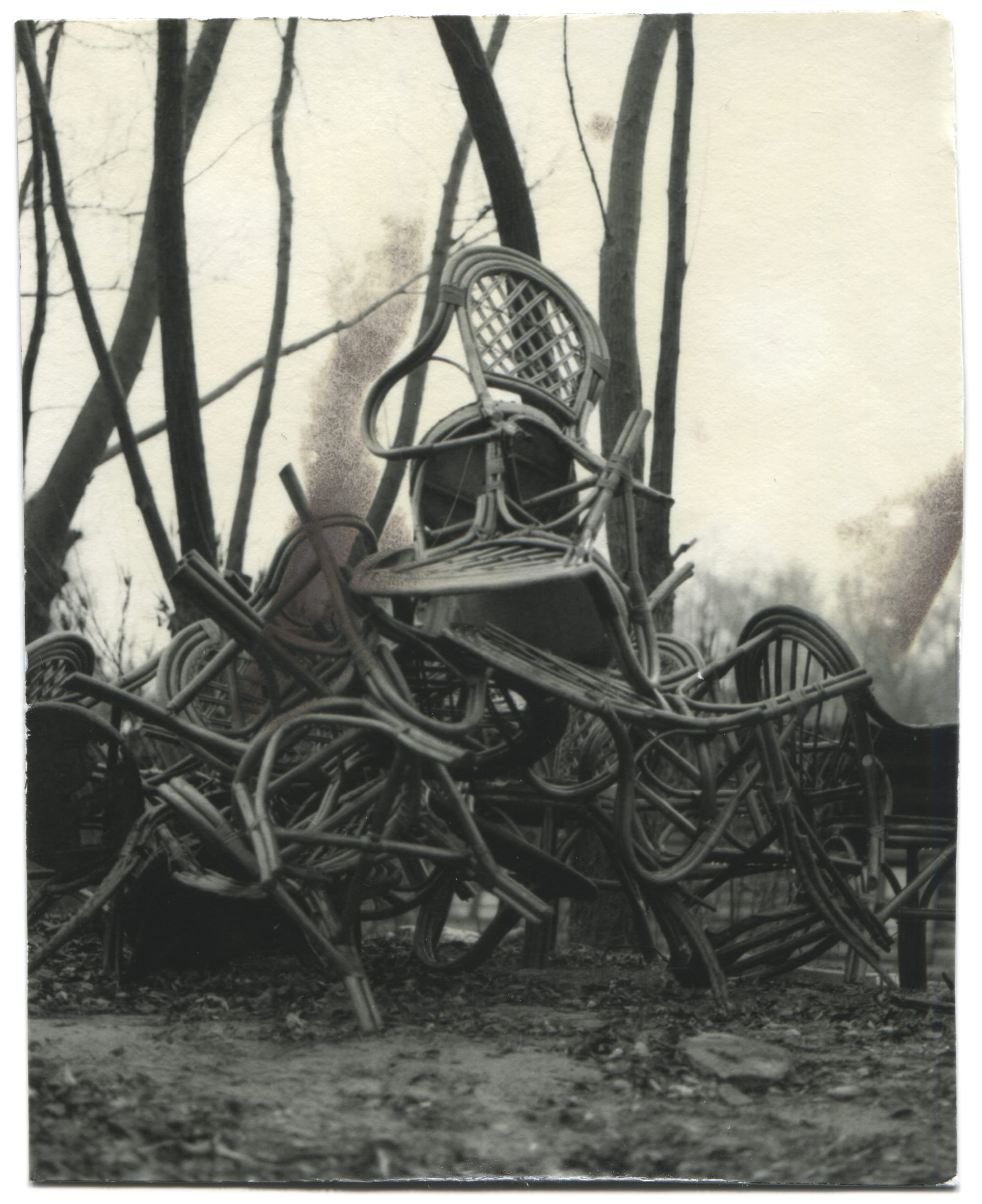 «A weathered pile of discarded chairs under the rain, photographed just days before the chaos. It is what it is, but for me, it is a very temporary sculpture dedicated to our time, the symbol of chaos, suspended dreams, plans, and hopes. It somehow holds itself, but will it rather rot to ashes first or just fall apart?»
